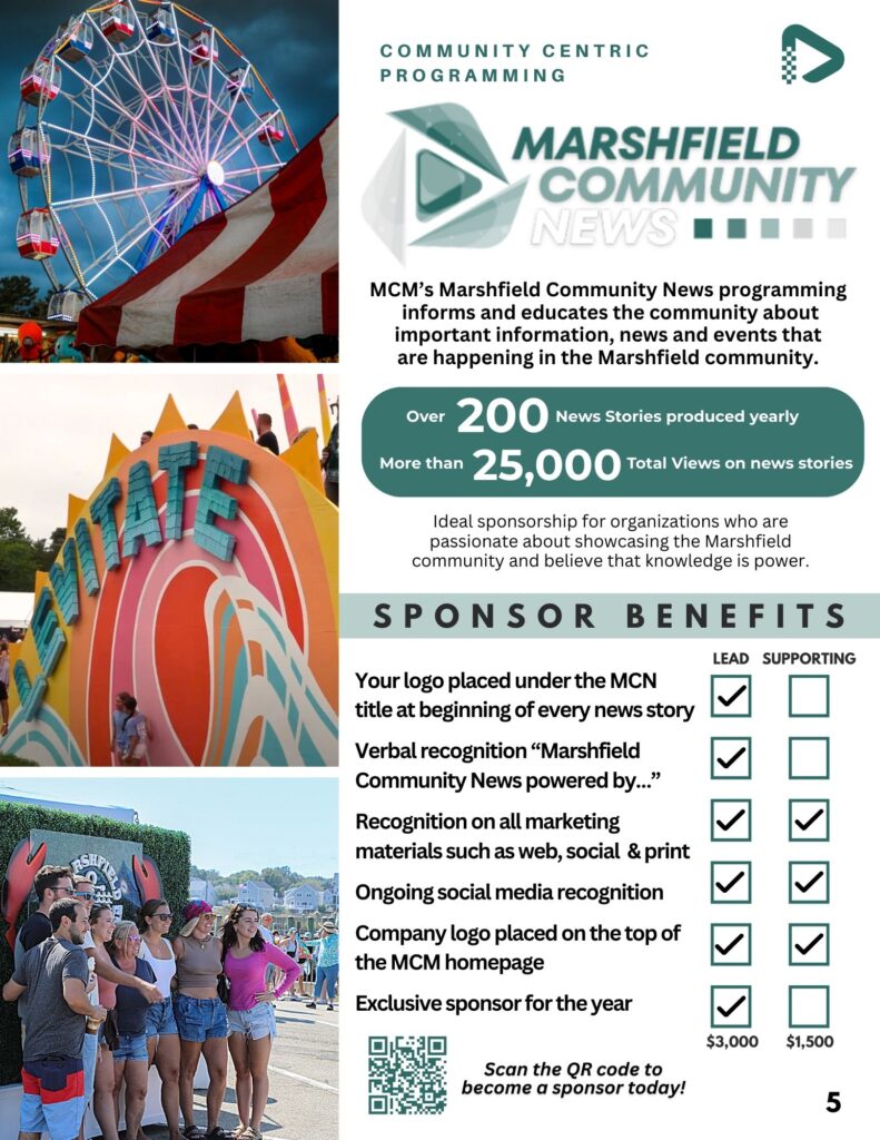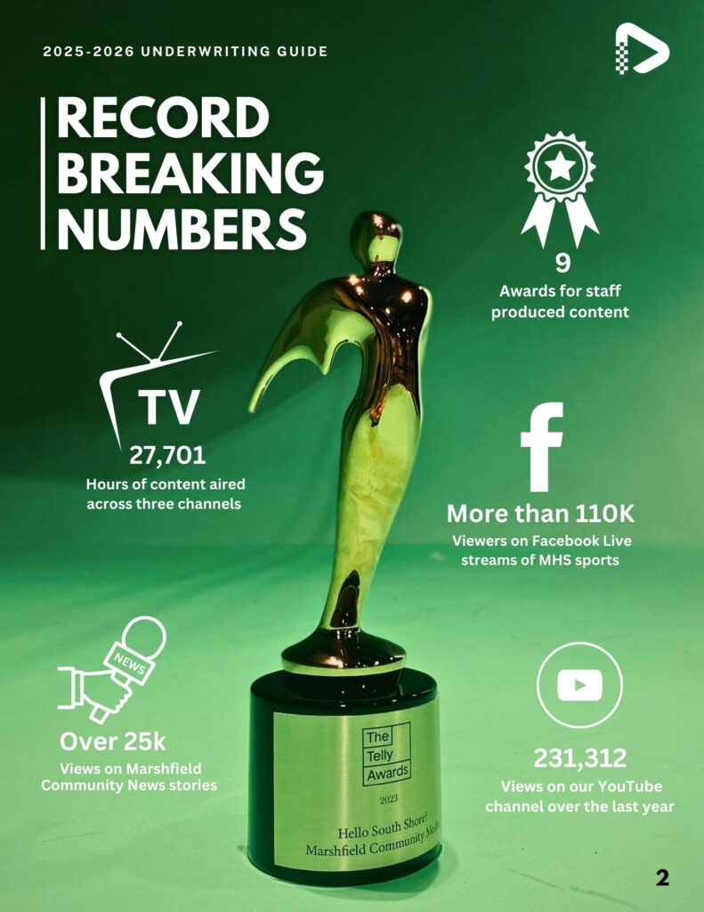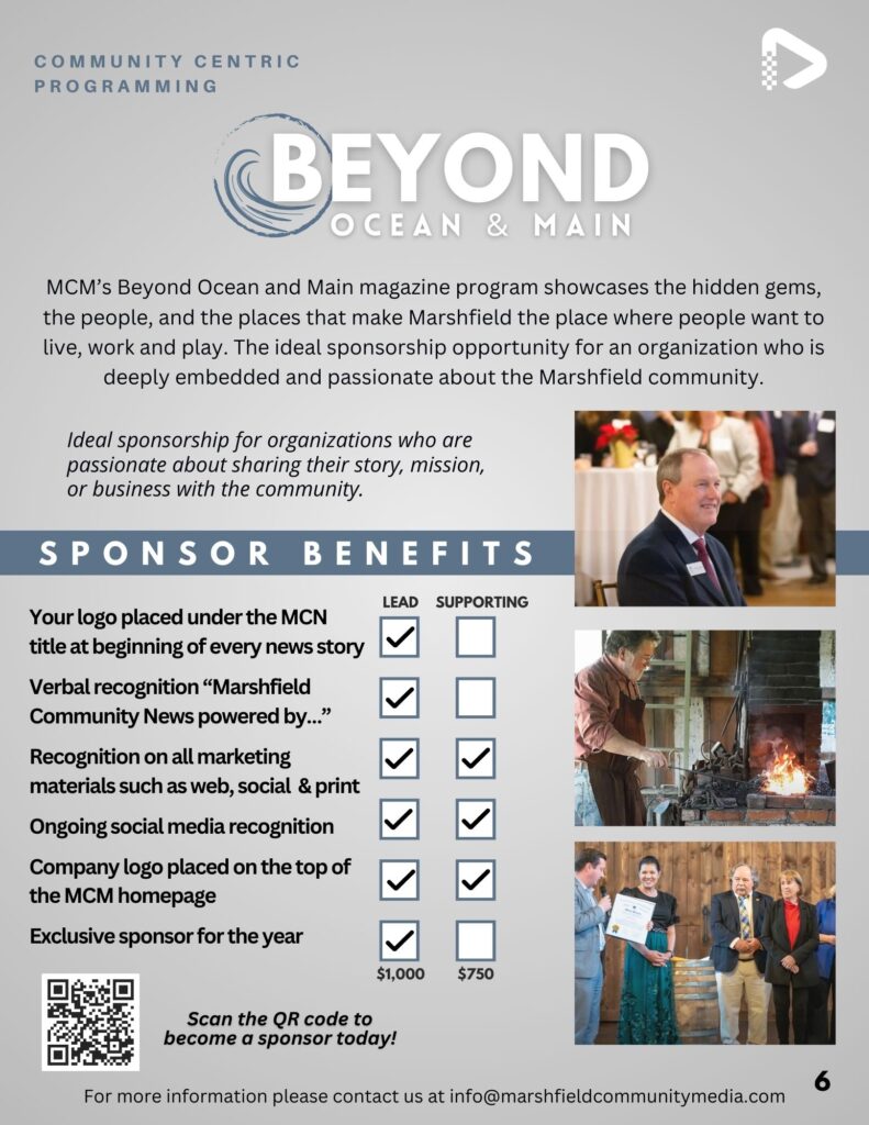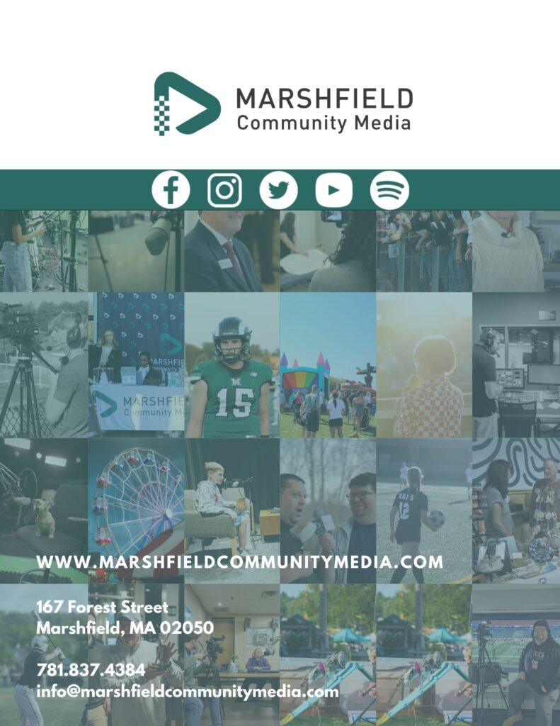 Underwriting possibilities range from assisting businesses to lend their support to community media while also reaching their target audience, supporting the important parts of town government, or for coverage of Board of Selectmen’s’ meetings. Contact us today to learn more about how you can support community media in the town of Marshfield!